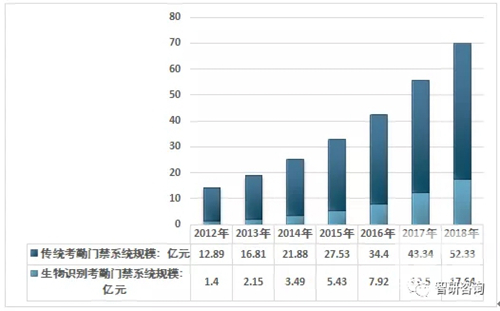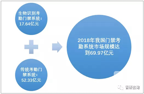 2018年我國考勤門(mén)禁系統市場(chǎng)規模達到69.97億元,來(lái)源:智研咨詢(xún)整理